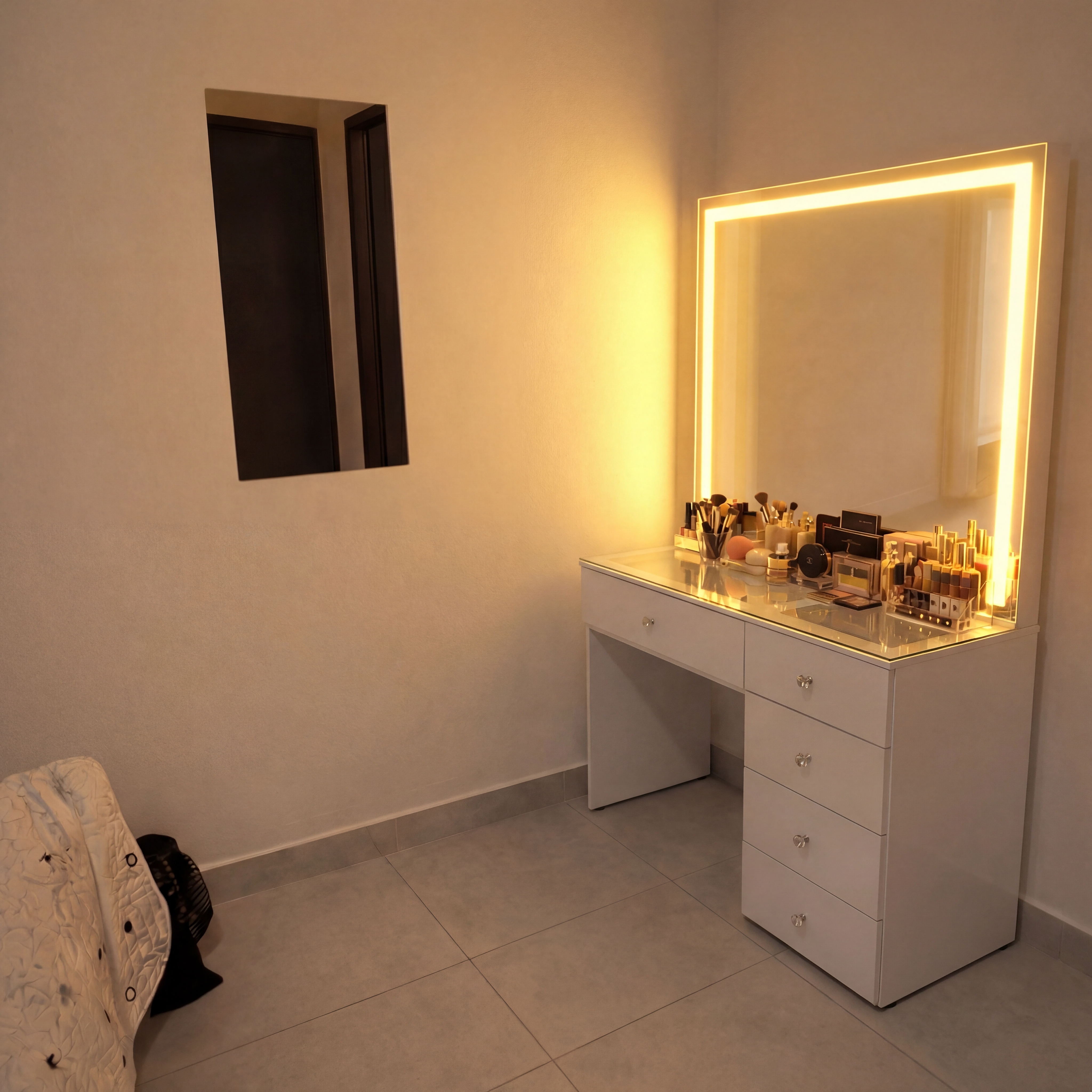 La característica más notable de este tocador es la iluminación incorporada en la parte superior y alrededor de los bordes del espejo. Las luces de estilo Hollywood son ajustables y proporcionan una iluminación perfecta para maquillarse o arreglarse. La luz blanca cálida es suave y no produce sombras, lo que significa que es fácil ver cada detalle de la piel y el maquillaje.